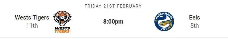 Home town favourites, the West Tigers tackle the Parramatta Eels at 8:00pm. I can already hear the roar 🐯
